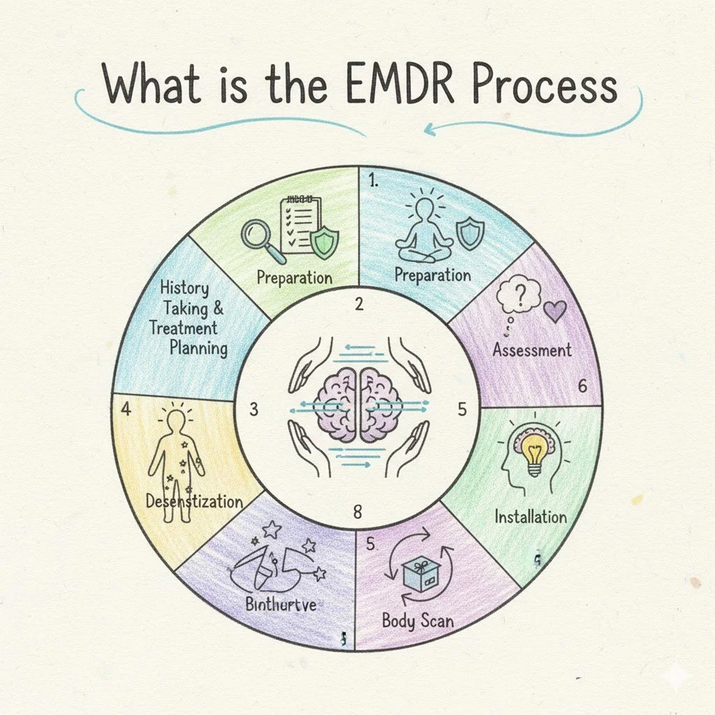 During EMDR, you recall distressing experiences while your therapist guides you through bilateral stimulation—usually eye movements or gentle tapping. This helps your brain actually "digest" and process emotions and memories that have been stuck, turning reactive patterns into resolved ones.